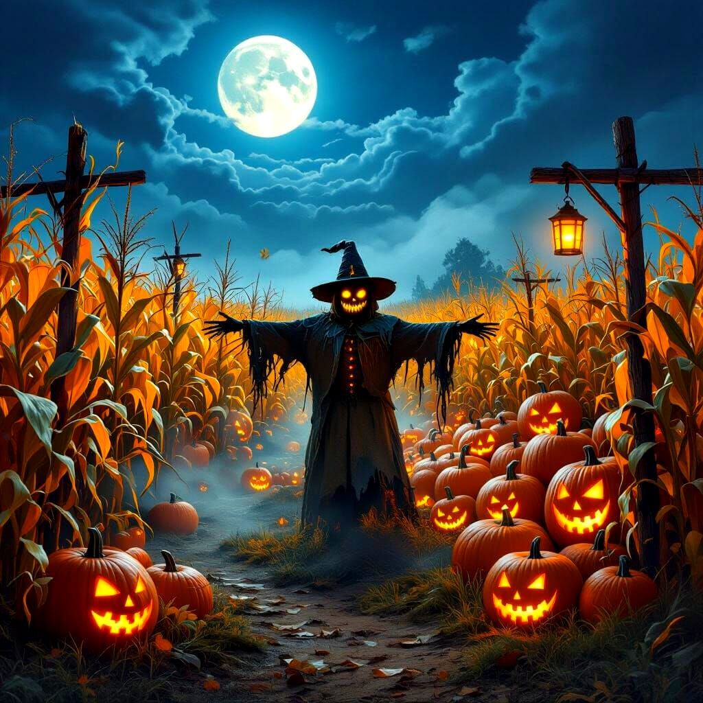 A spooky autumn harvest scene blending Halloween and fall abundance. A haunted corn maze twists through golden fields under a full moon, its stalks whispering in the wind. At the center stands a ghostly scarecrow with glowing eyes and tattered clothes, arms outstretched as if alive. A sprawling pumpkin patch glows with jack-o’-lantern faces, their light flickering like trapped spirits. Mist drifts across the ground, and eerie shadows stretch under lanterns hung on crooked posts. The atmosphere is eerie yet festive, blending the bounty of harvest with the mystery of Halloween. Ultra-detailed, cinematic gothic fantasy art, glowing eerie colors, spooky autumn mood.