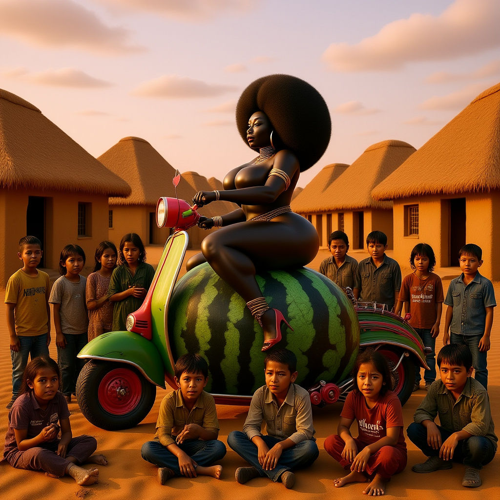 This image shows a Black woman riding a watermelon scooter that emits smoke. The vibrant matte painting, rich with intricate detail, captures a lively street scene with amazed bystanders. This fantasy concept art is rendered in 8k resolution.