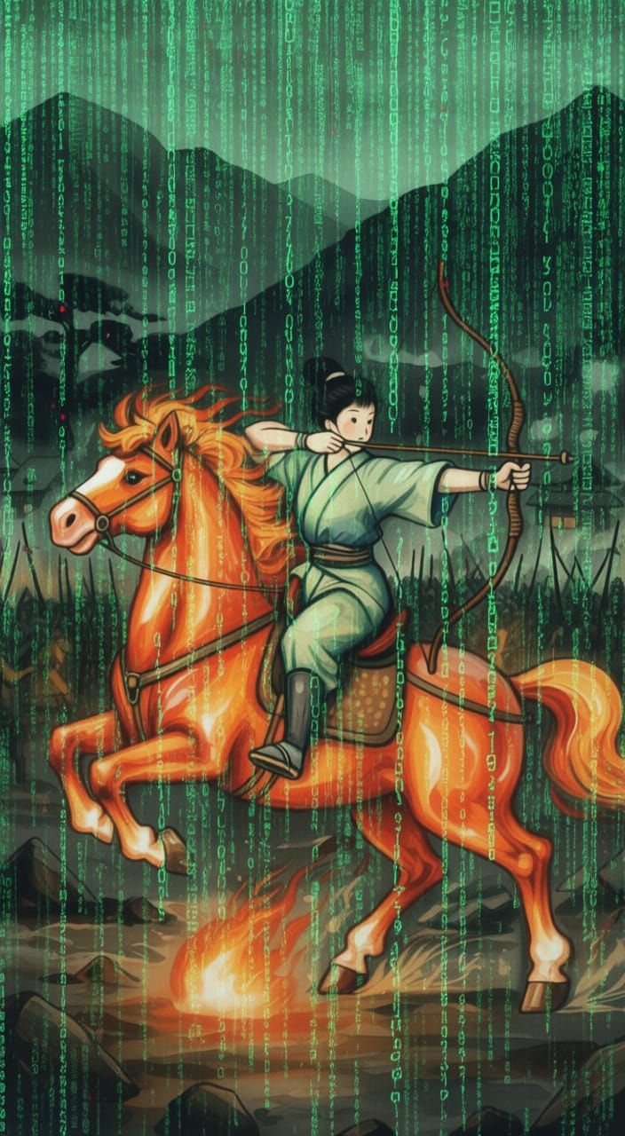 Bring an Old Creation Back to Life, New Year, New Creative Me, everything is made of cascading computer code, conceptual Matrix digital painting, Code falling like rain in a series of numbers and カナ, elements of newness in a Japanese archer drawing her bow riding on a cute braying flaming horse in an ...