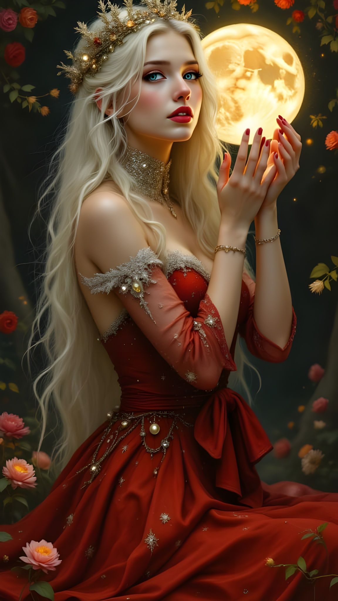 This image depicts a beautiful woman with long blonde hair, wearing an ornate dark red dress with a lace collar, reaching up to hold a large moon. The style evokes classical oil painting.
