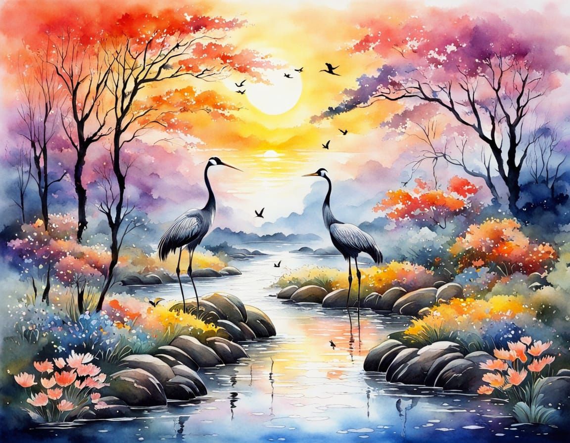 This image depicts a serene creek scene with two cranes standing on a stake, surrounded by vibrant flowers and set against a backdrop of a stunning sunrise with imperial colors, evoking a sense of mysticism and wonder.