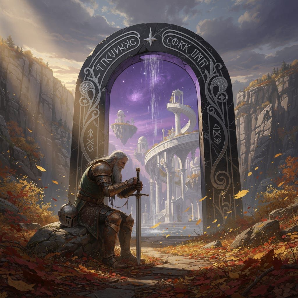 A dark fantasy concept art image of a weary knight with grey hair and beard sitting by a massive sword. He waits before a colossal obsidian archway reflecting a mystical, other-worldly landscape.
