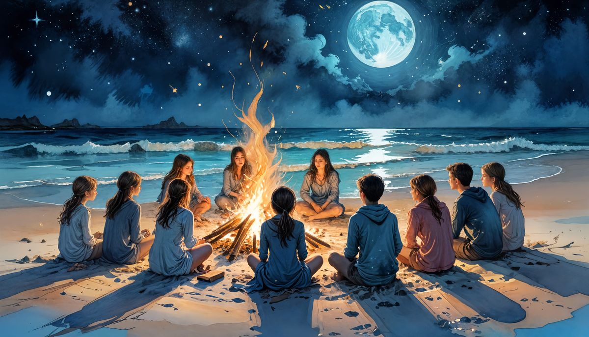 A glowing bonfire on the beach, surrounded by friends under a starry sky.