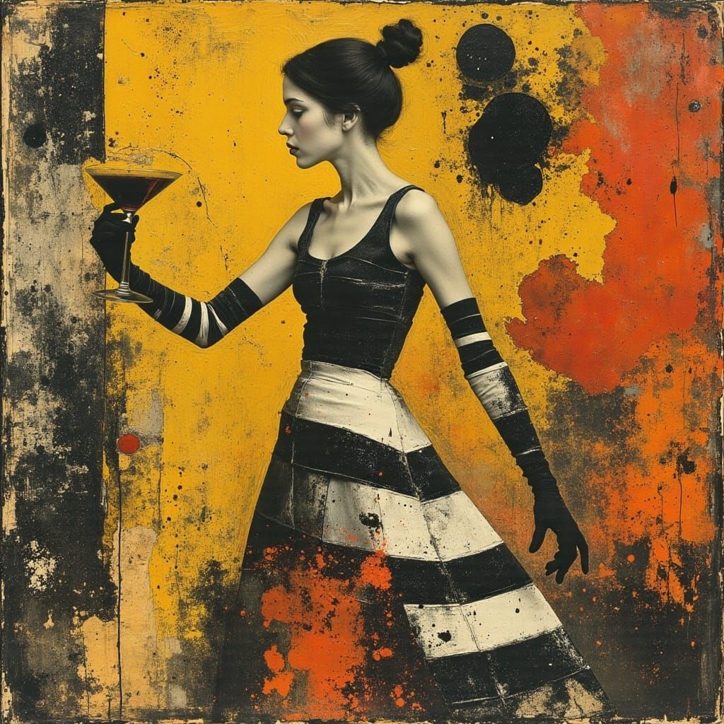 A vibrant image of a woman in a black and white dress holding an espresso martini. The scene blends elements of coffee, milk, and honey with warm, earthy tones in an impasto style.