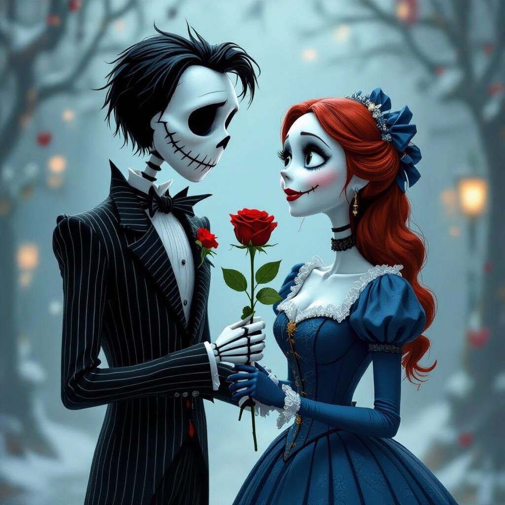 A romantic Jack Skellington and Jane portrait. They stand in smart dress in the snow as he gives her a rose. They look lovingly in each other's eyes.
