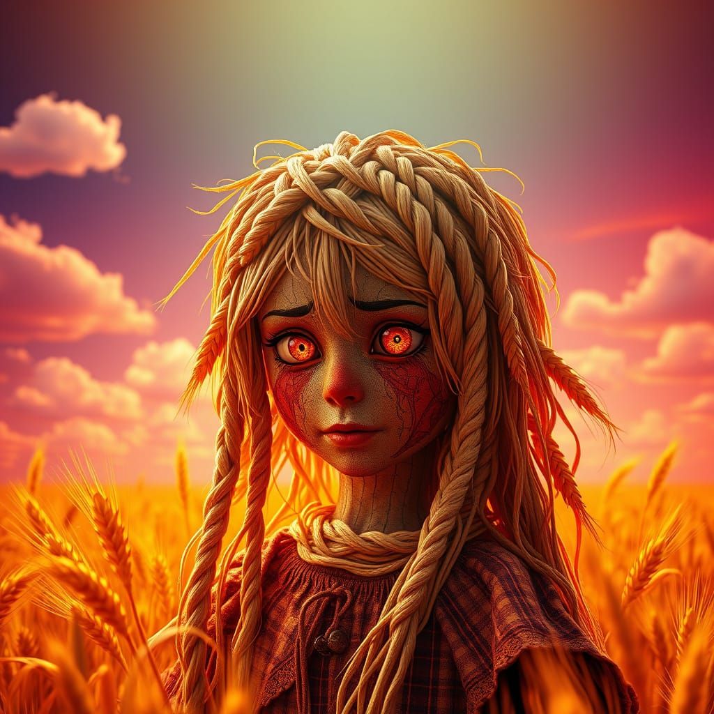 This striking portrait of a straw scarecrow girl showcases intricate braids and wheat-adorned hair, set against a dynamic autumnal sky with vibrant orange, red, and yellow hues. The image features hyperdetailed textures and patterns, reminiscent of cyberpunk and fantasy art styles, with a touch of organi...