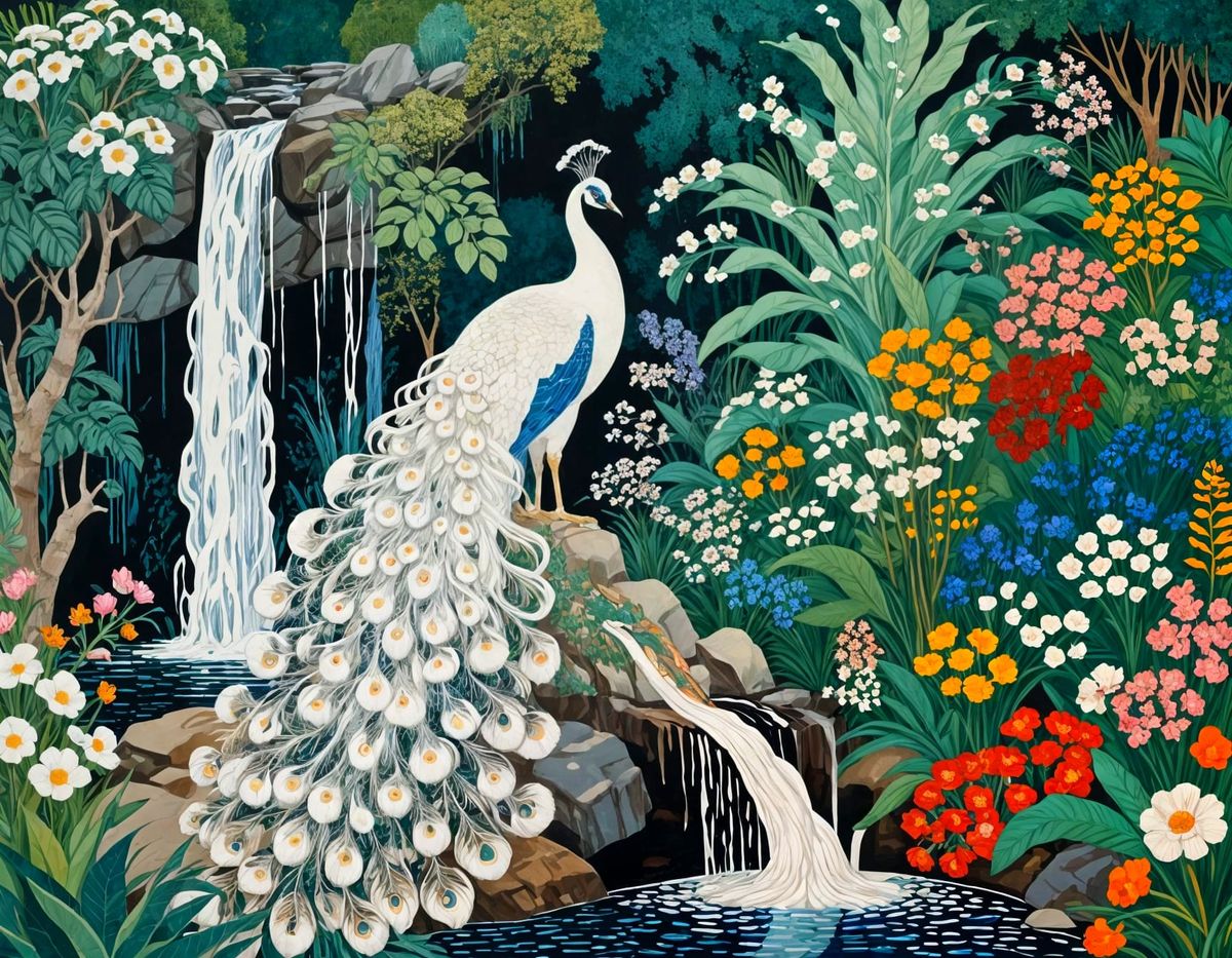 A vibrant linocut print of a white peacock in a lush garden with a waterfall. The artwork evokes the style of late 19th-century painting through its use of color and pattern.