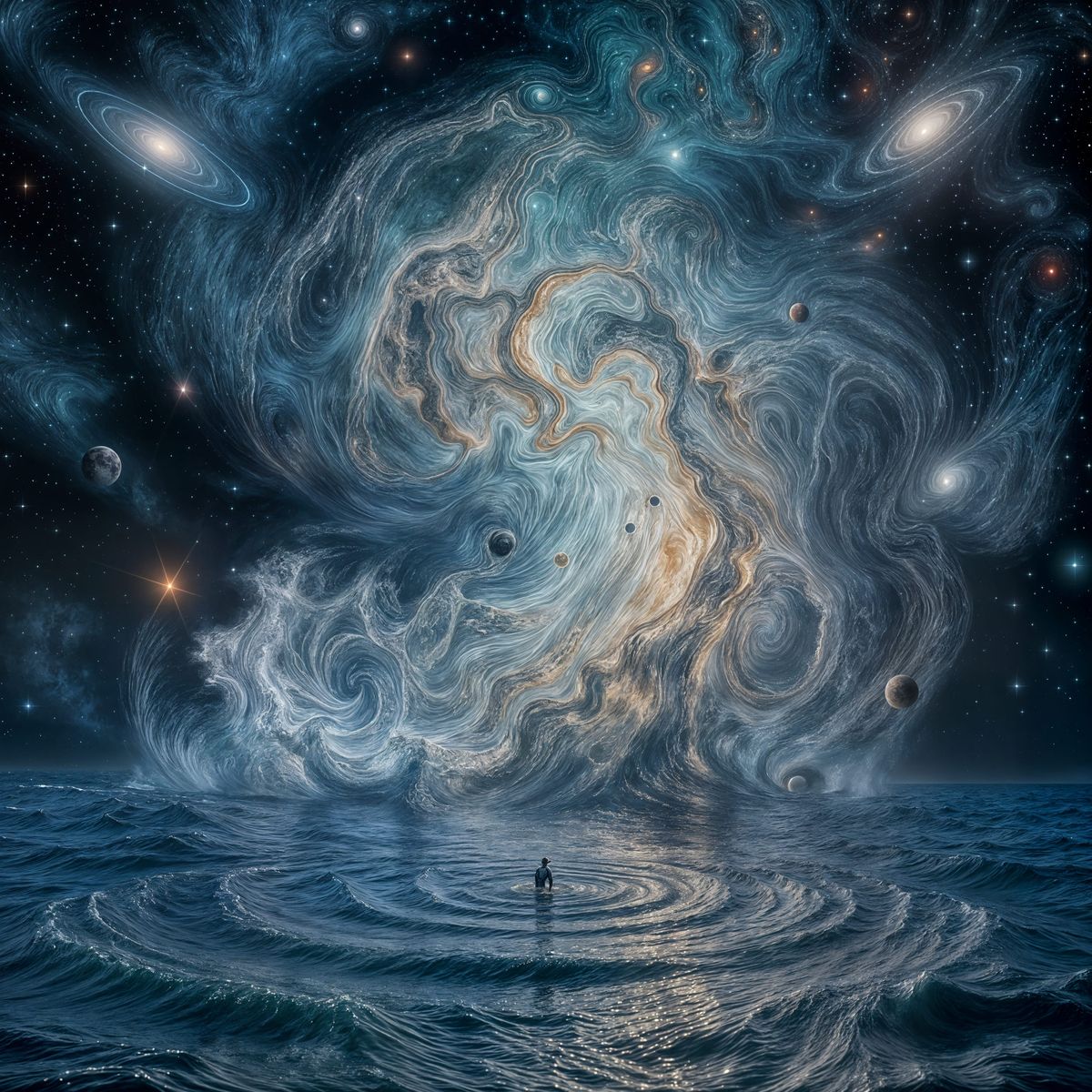 This image depicts a small ripple evolving into a massive wave within the vast expanse of the cosmos, symbolizing growth and change.
