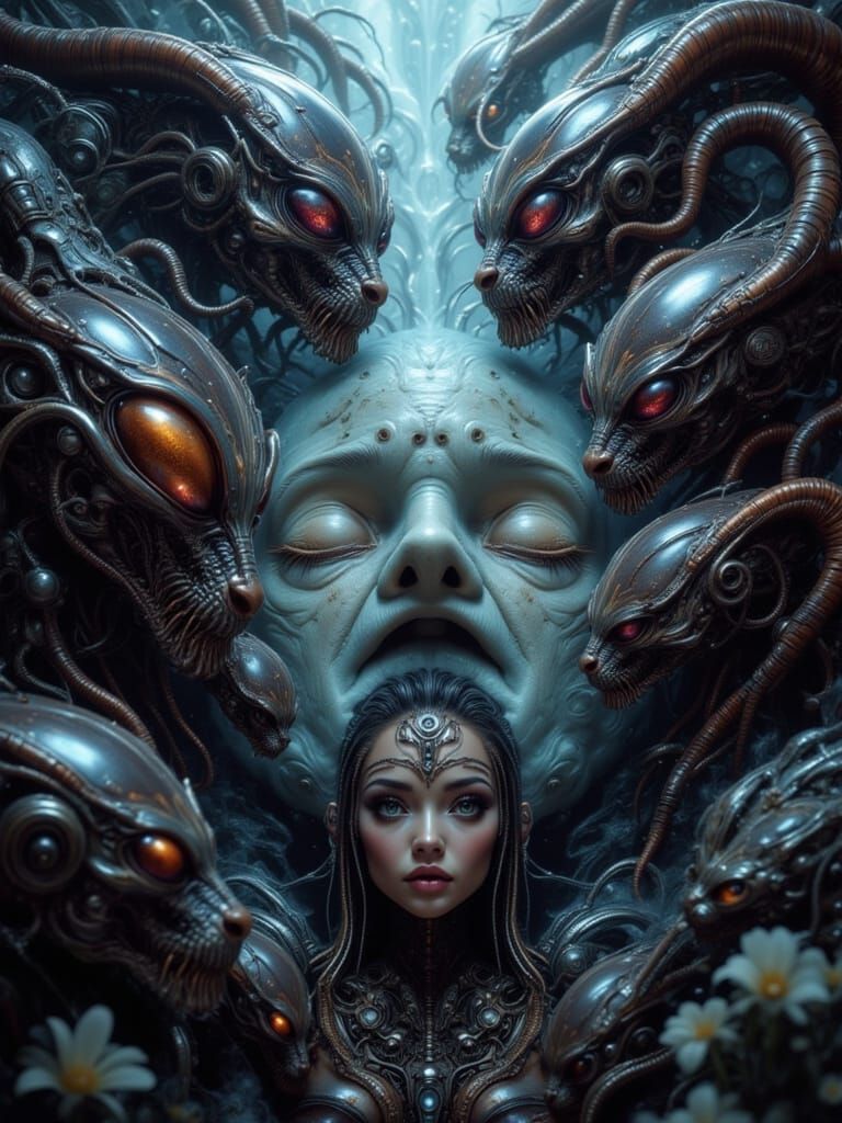 This concept art captures a human being observed by multiple aliens, suggesting a shared awareness of their species. Rendered with hyperdetailed, intricate elements and dynamic lighting.