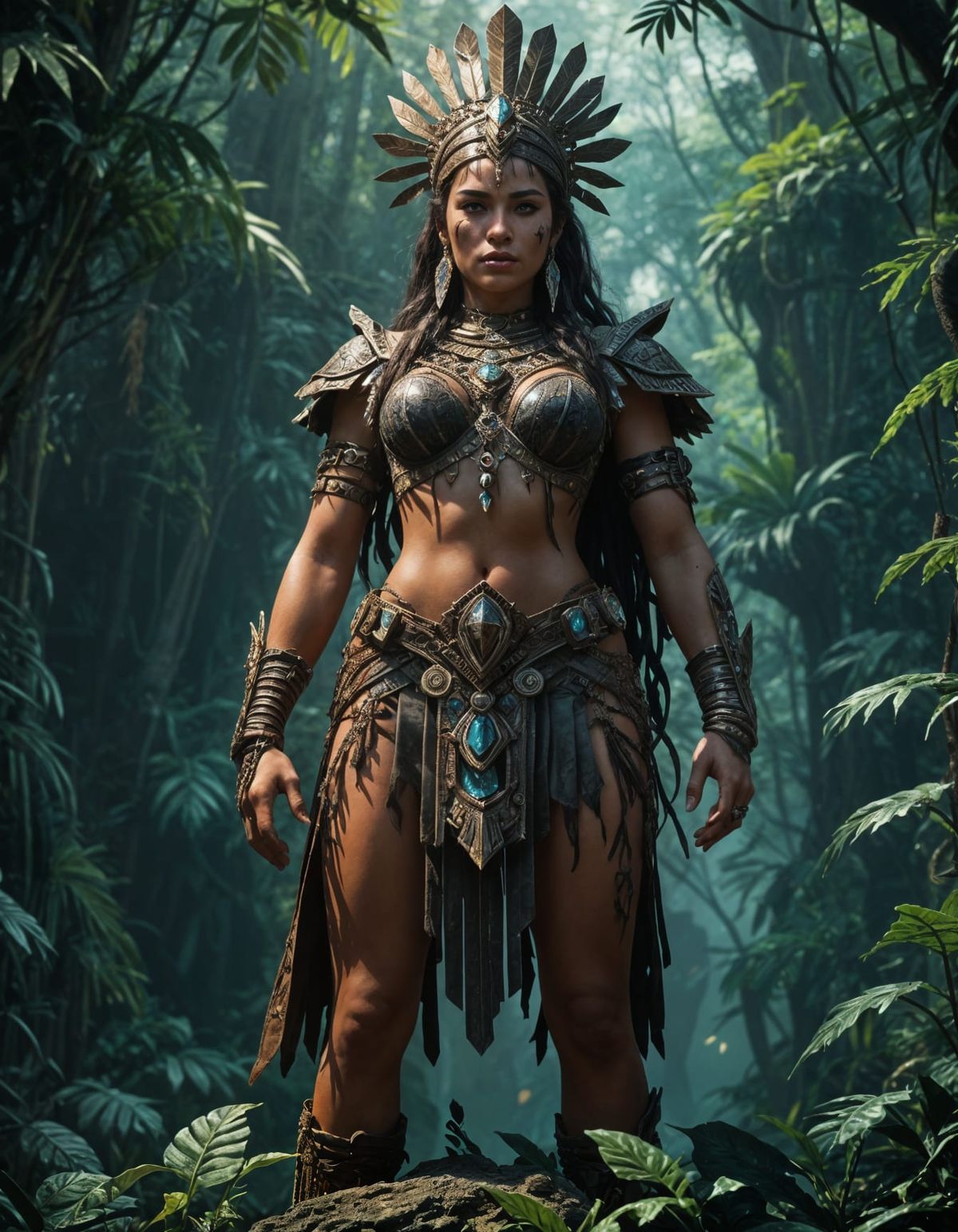 in a intimidating hero pose , A formidable tribal queen, adorned with tribal breast plate intricate jewelry and battle scars, stands atop a towering ziggurat in the heart of a lush, primordial jungle. Sunlight filters through the dense canopy, casting dappled shadows on her muscular physique. her expression ...