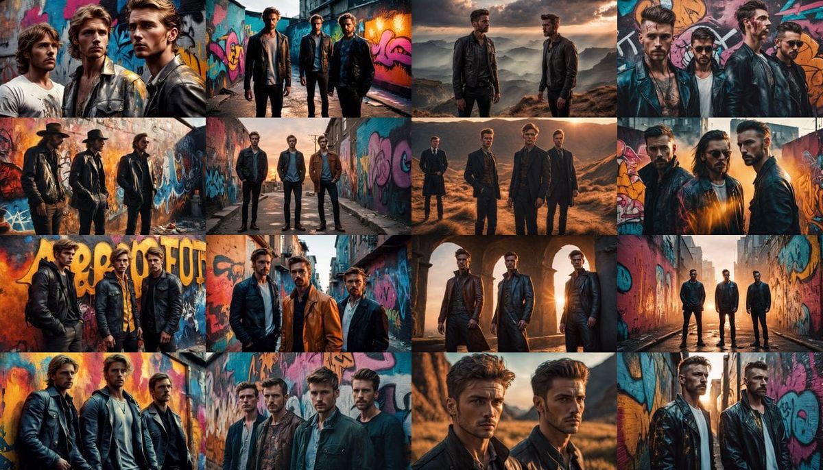 This cinematic image depicts three handsome men as sci-fi empire leaders, Dawn, Day, and Dusk. Captured with sharp focus and atmospheric lighting, it resembles a high-quality film still.