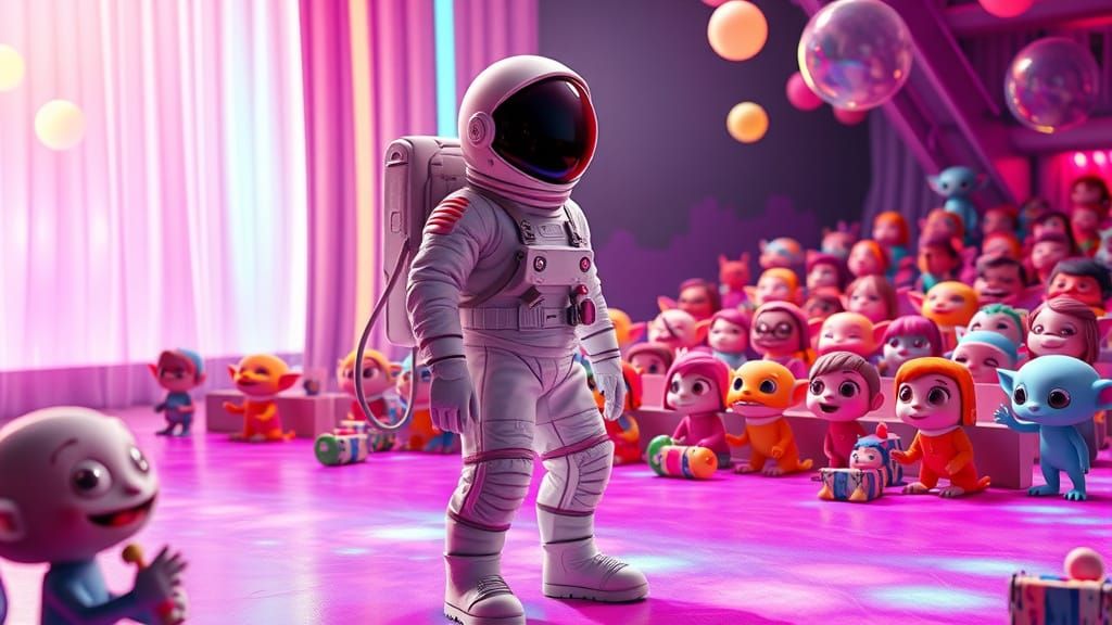 On a glowing alien stage, a human astronaut is the star attraction—observed by a crowd of tiny, wide-eyed extraterrestrials. A surreal, whimsical performance where wonder and absurdity meet under the spotlight.