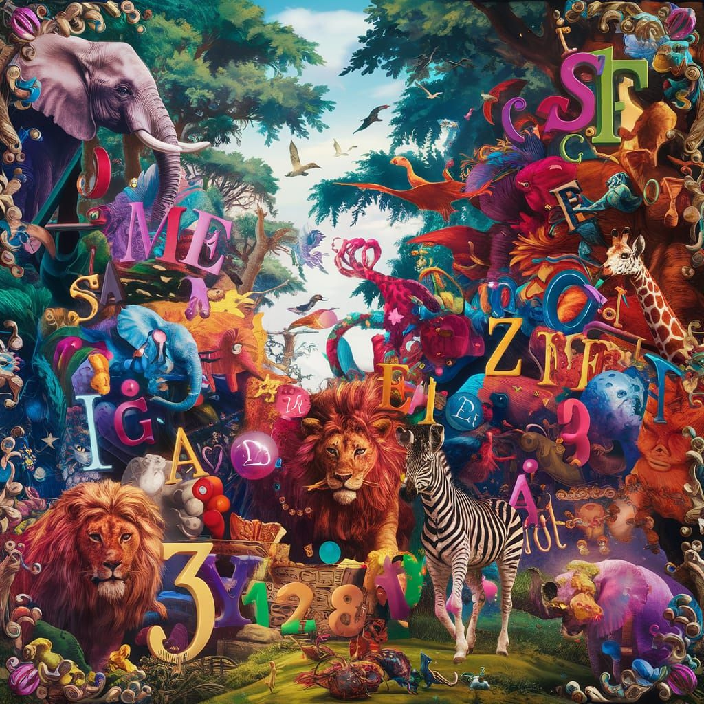 A vibrant matte painting showcasing a fantastical scene filled with colorful animals, letters, and numbers. The lush forest background and splash screen effect add to the intricate detail.
