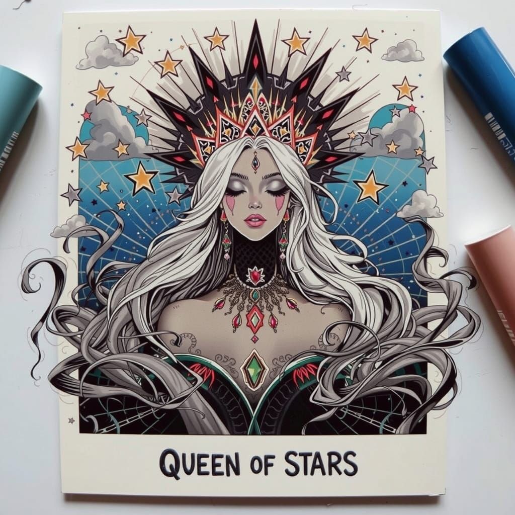 This image shows a beautiful young girl embodying the queen of stars. It captures a celestial essence with a focus on youth and beauty.