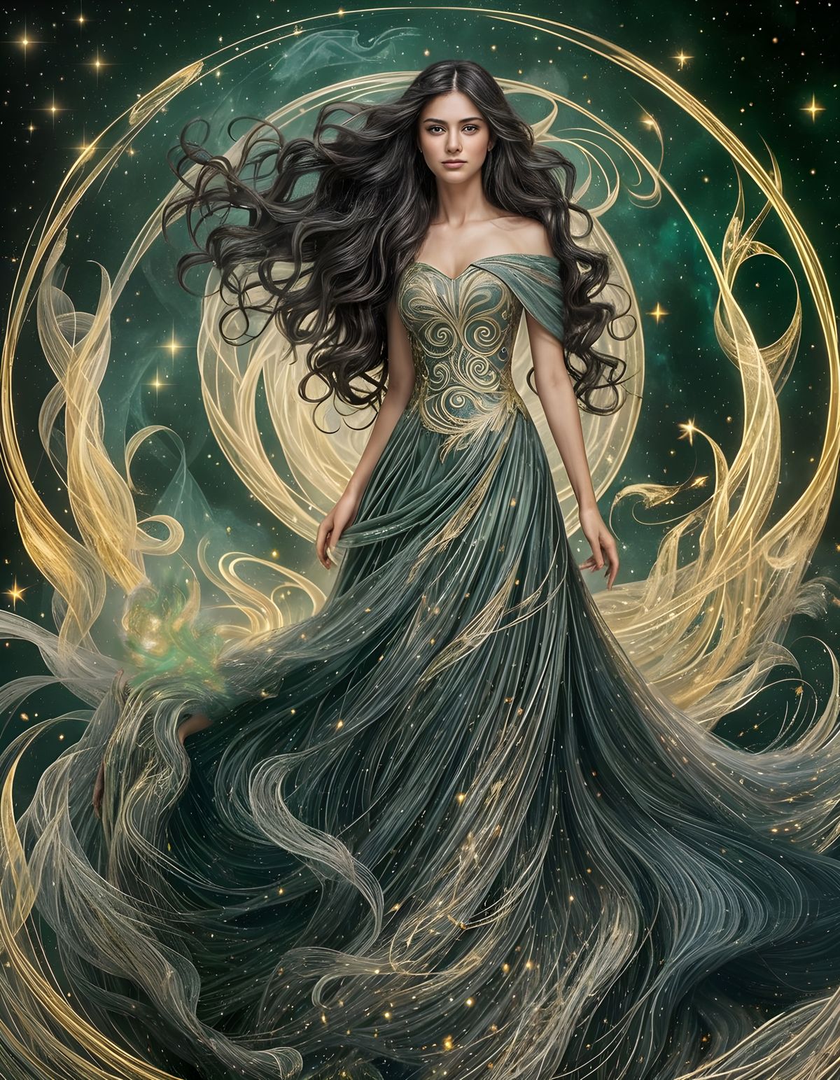 A stunning portrait of a young woman in a lavish golden gown surrounded by swirling flames and celestial symbols against a dark emerald background, showcasing her beauty and mystique.