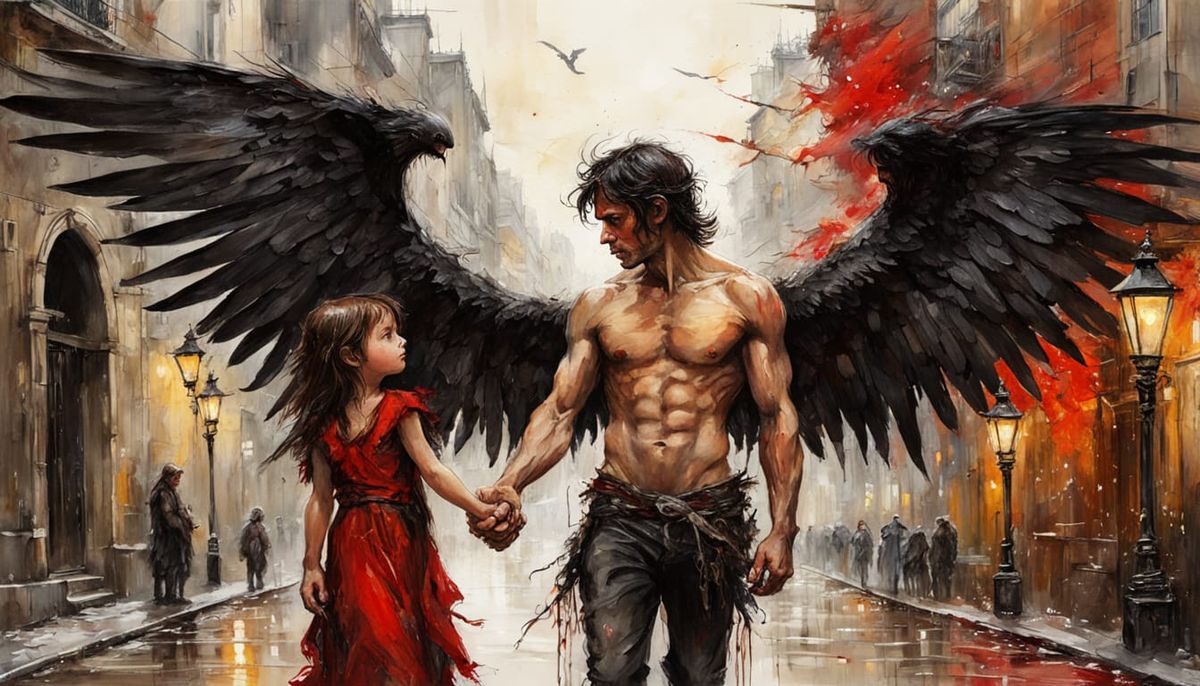 A digital painting shows a red demon shaking hands with a white angel on an old French street. The image uses vibrant colors and soft watercolor techniques to evoke sadness.
