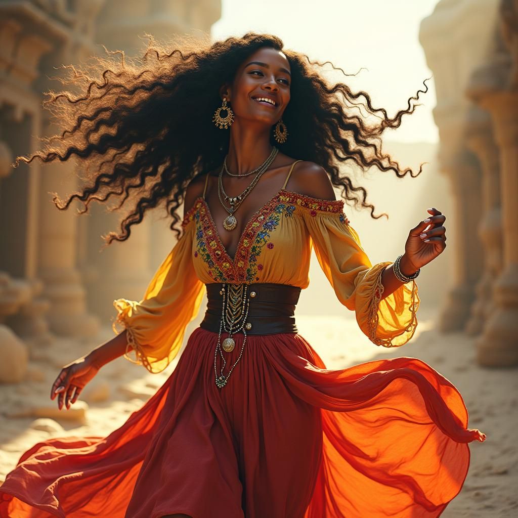 A vibrant image of a woman dancing freely in a dreamlike setting. Her attire includes a peasant top, flowing skirt, corset belt, and layered jewelry, all rendered in rich colors and textures.
