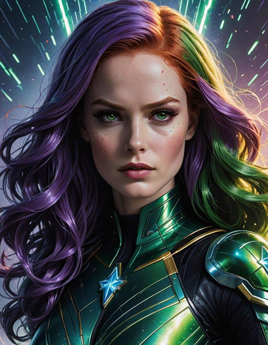 A striking picture of a woman with vibrant green hair manipulating magnetic fields. This comic book style image features dynamic lighting, metallic accents, and a powerful superheroine in action.