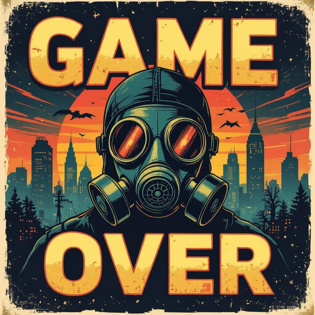 This image shows vintage album cover art with a gas mask. The artwork features retro horror vibes, a dark science fiction city background, and bold text in a retro sci-fi graphic style.
