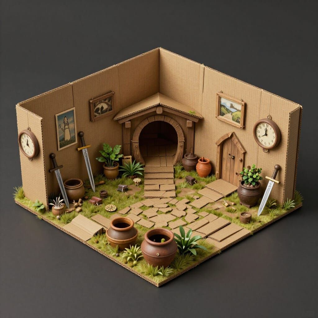 This image showcases a detailed matte painting of a cardboard fort resembling a Lord of the Rings hobbit hole, complete with decorative items and a fantastical, deep color palette.