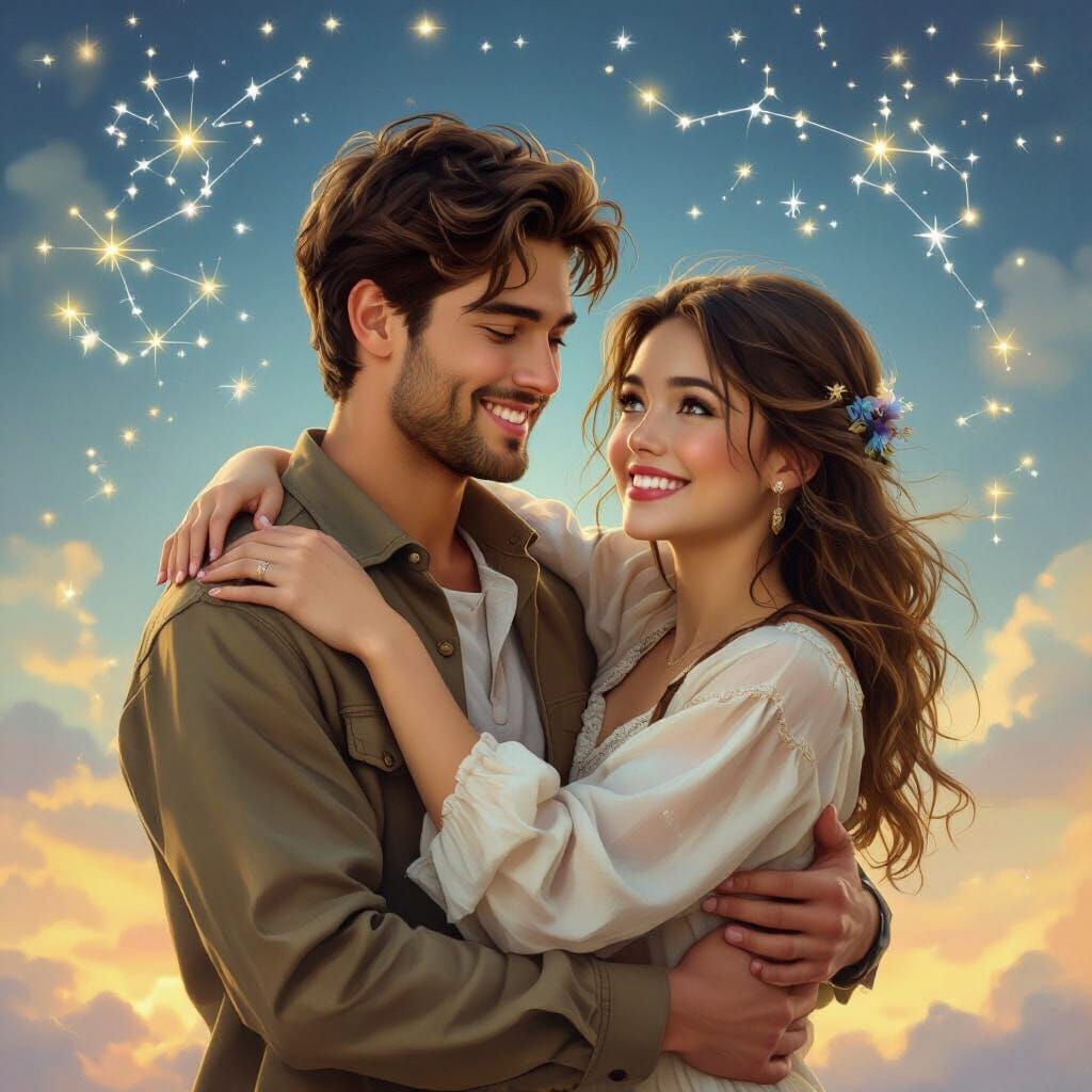 This image shows a loving couple stargazing together on a misty night. The hyperdetailed fantasy scene evokes ethereal romance with natural skin tones.
