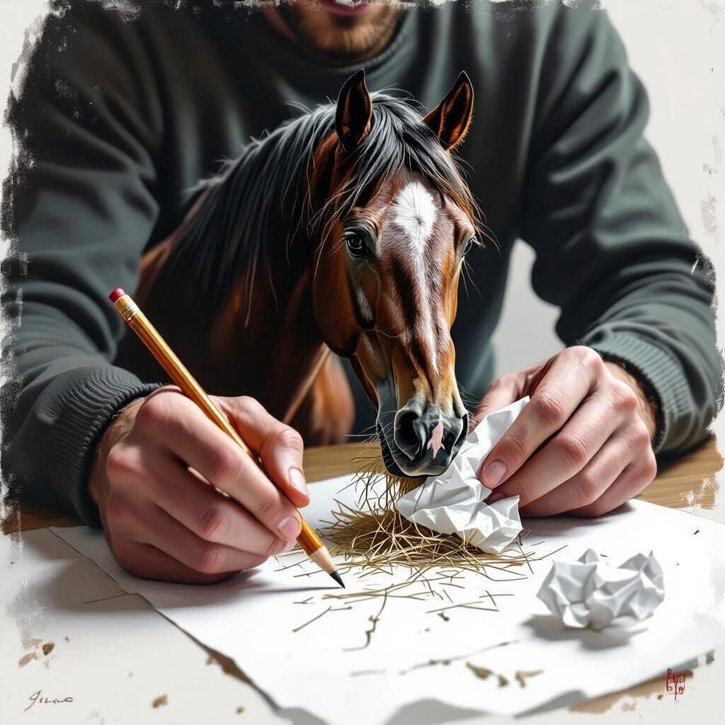 A realistic drawing of a horse eating hay being sketched by a human hand. The image features subtle textures and nuanced lighting for a hyper-realistic effect.