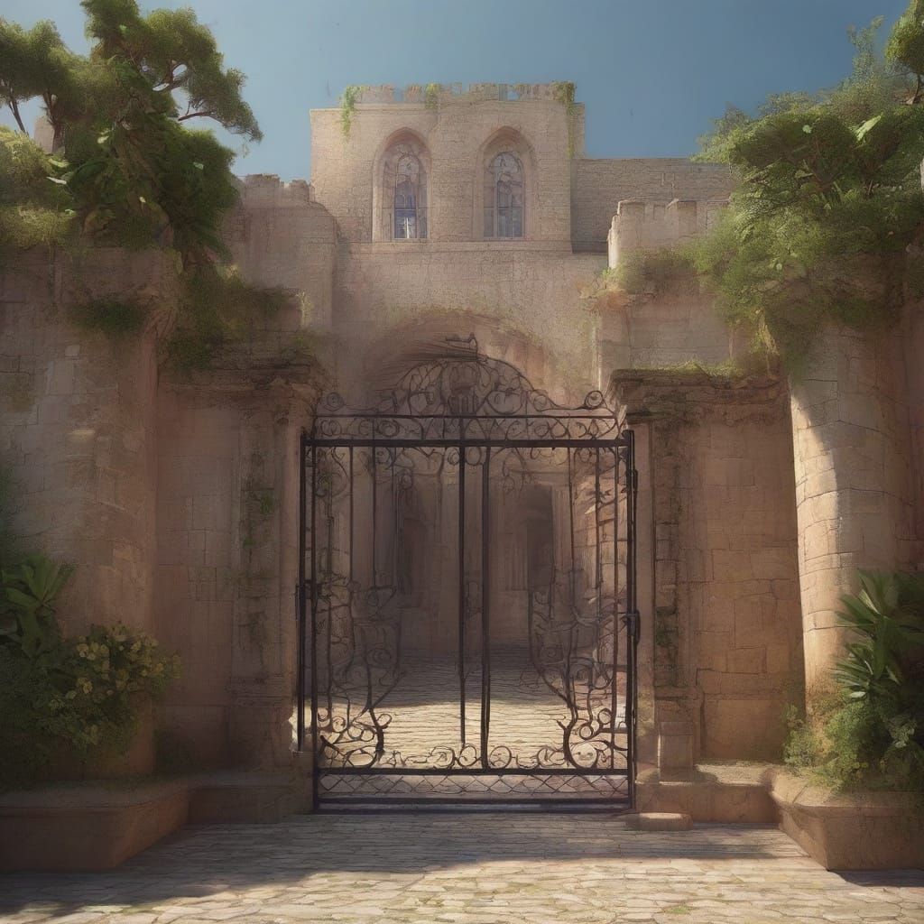 A digital matte painting of a walled Italian city fortress on a tropical island, featuring abundant flowers and trees. Warm sunlight illuminates open gates and a distant church.