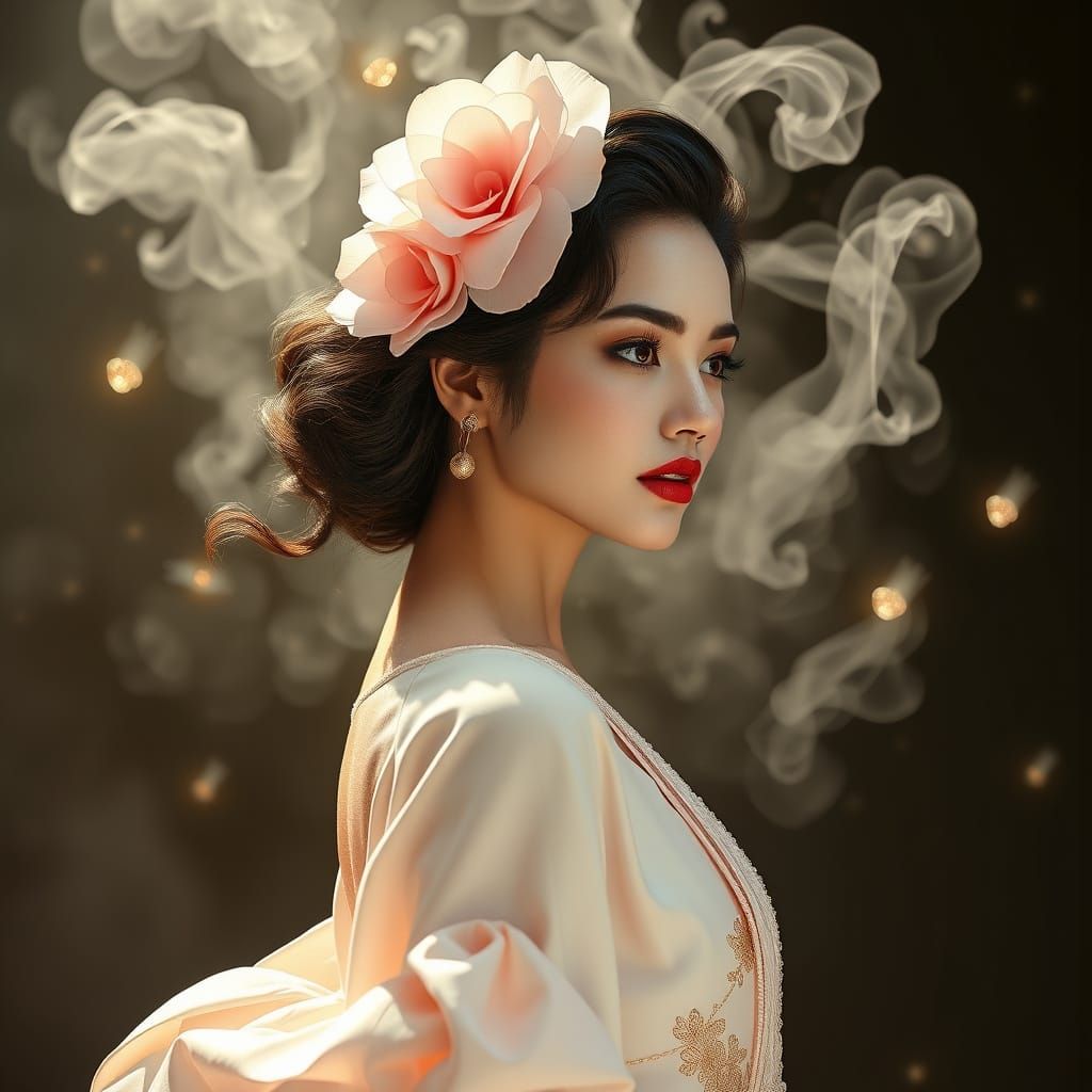 A stunning image of a beautiful woman enveloped in a cloud of atomized perfume. The artwork features a hyperrealistic style with soft textures, pastel colors, and an ethereal atmosphere, reminiscent of art nouveau.