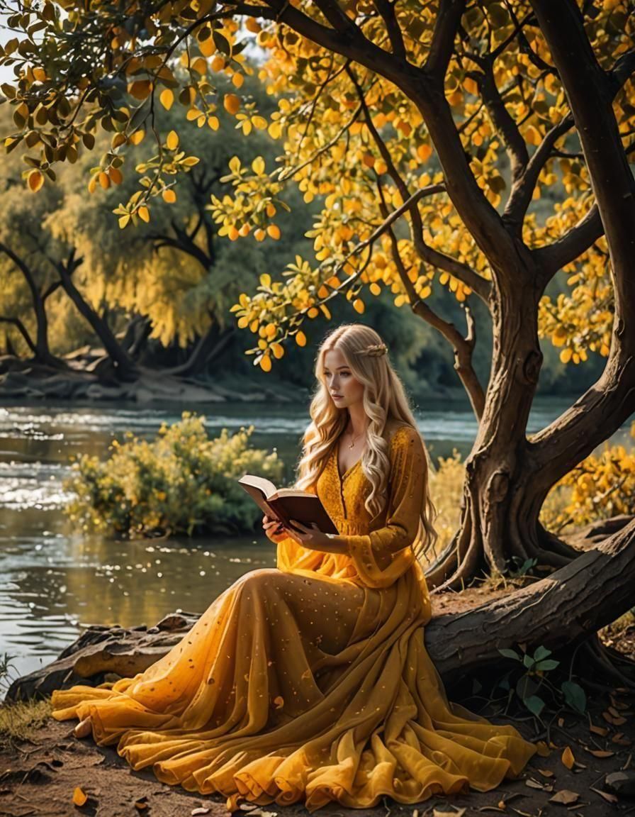 "A beautiful blonde girl with long hair and freckles in a long yellow see thru sheer dress sitting under orange tree by the river reading a book deep rich colors full screen image magical mystical enchanting fantasy perfect proportions perfect composition"
