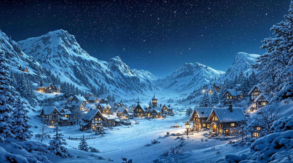 This enchanting image depicts a miniature feudal Norwegian village nestled in a snowy valley, bathed in the soft glow of warm lights against the cool blue of the night sky, with intricate details and a sense of magical wonder.