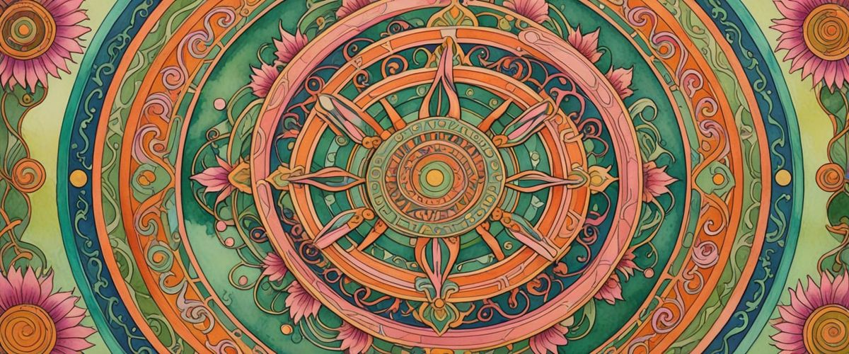 A vibrant image of a Tibetan mandala ramachakra acharya in the Art Nouveau style. Watercolor and gouache techniques are used to create soft orange contours and delicate green and pink patterns, illuminated by warm sunlight.