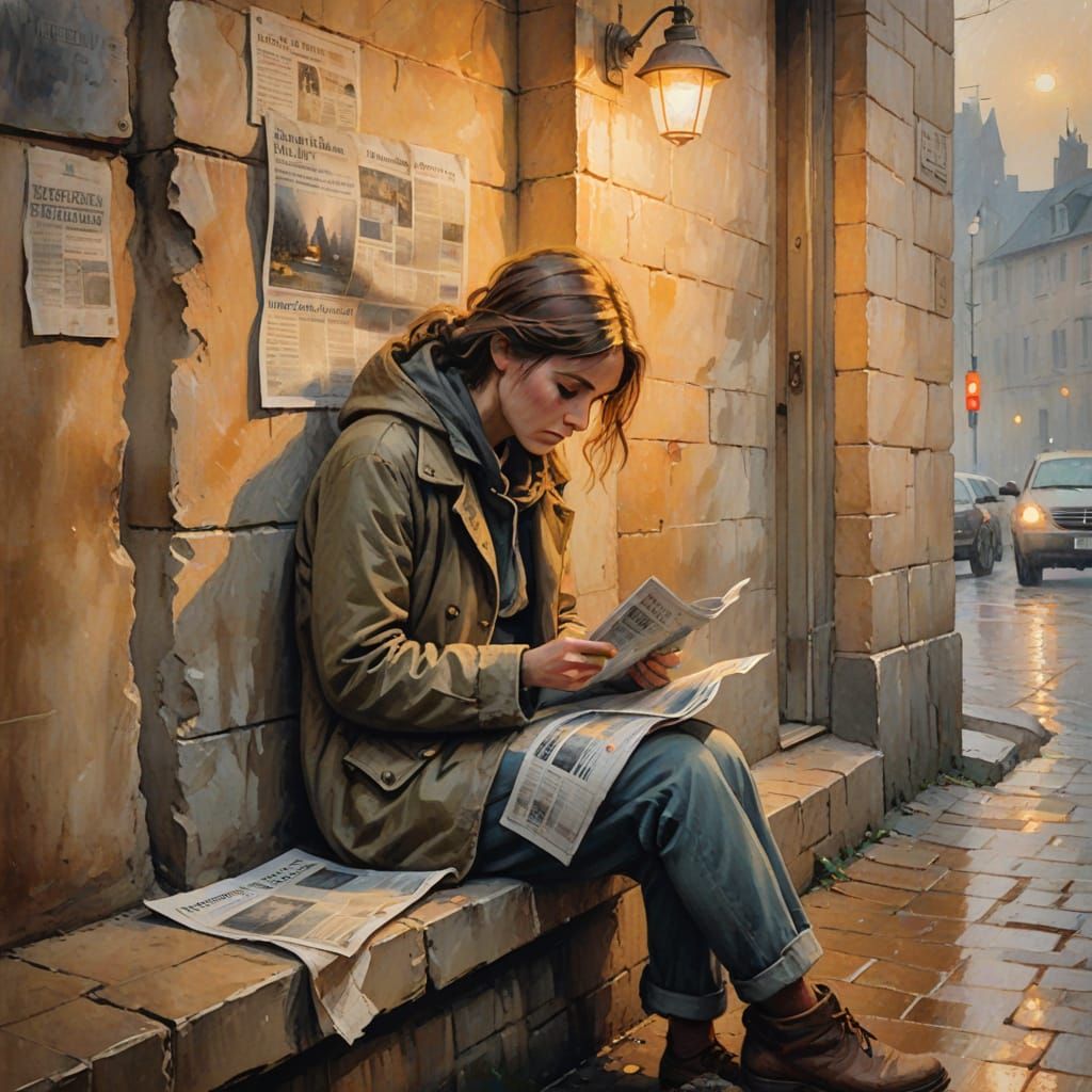 This image shows a homeless girl reading a newspaper in the rain. The image evokes 19th-century impressionism with soft watercolor textures and a muted color palette, bathed in golden evening light.