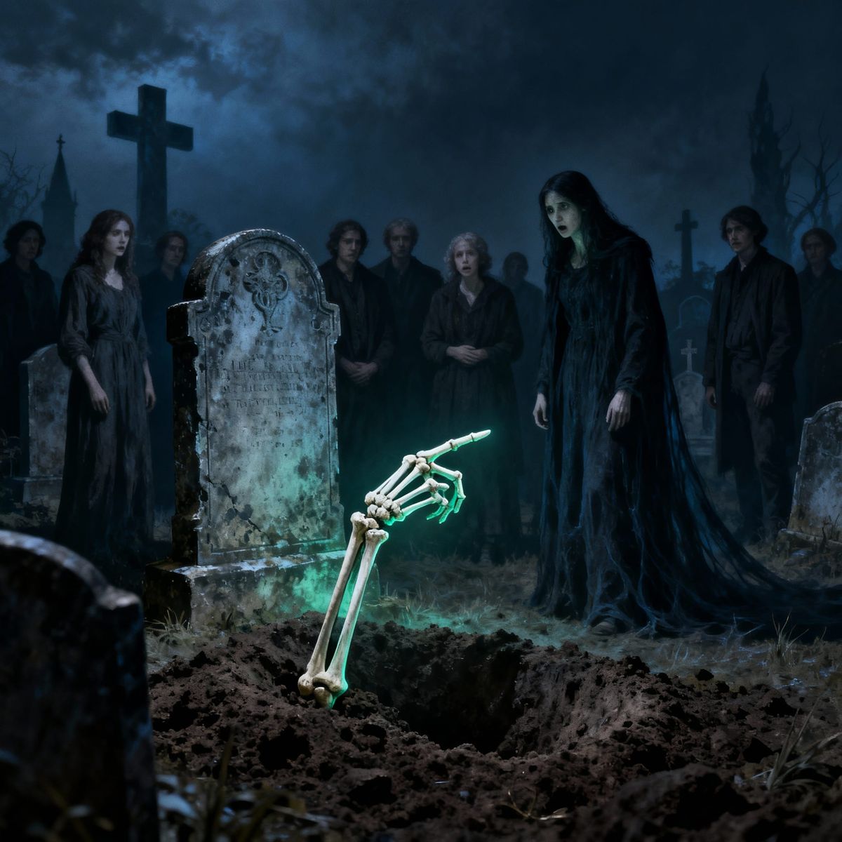 This image shows a dark fantasy illustration of a graveyard scene. A skeletal hand emerges from the earth, pointing at a startled person among a somber crowd gathered around a gravestone.