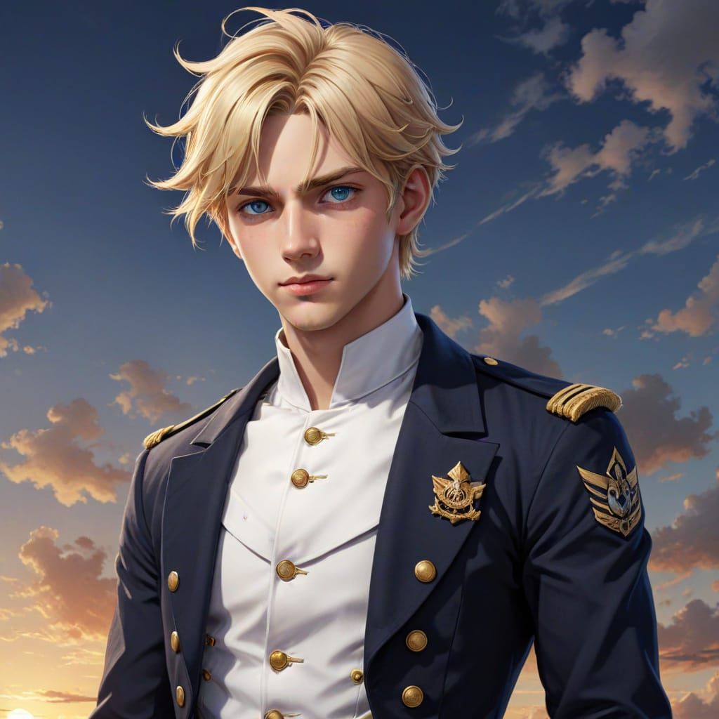 This image is a digital art piece of a handsome young man in a vintage US Navy uniform, showcasing his bright blue eyes and blonde hair, reminiscent of traditional Japanese manga and anime art.