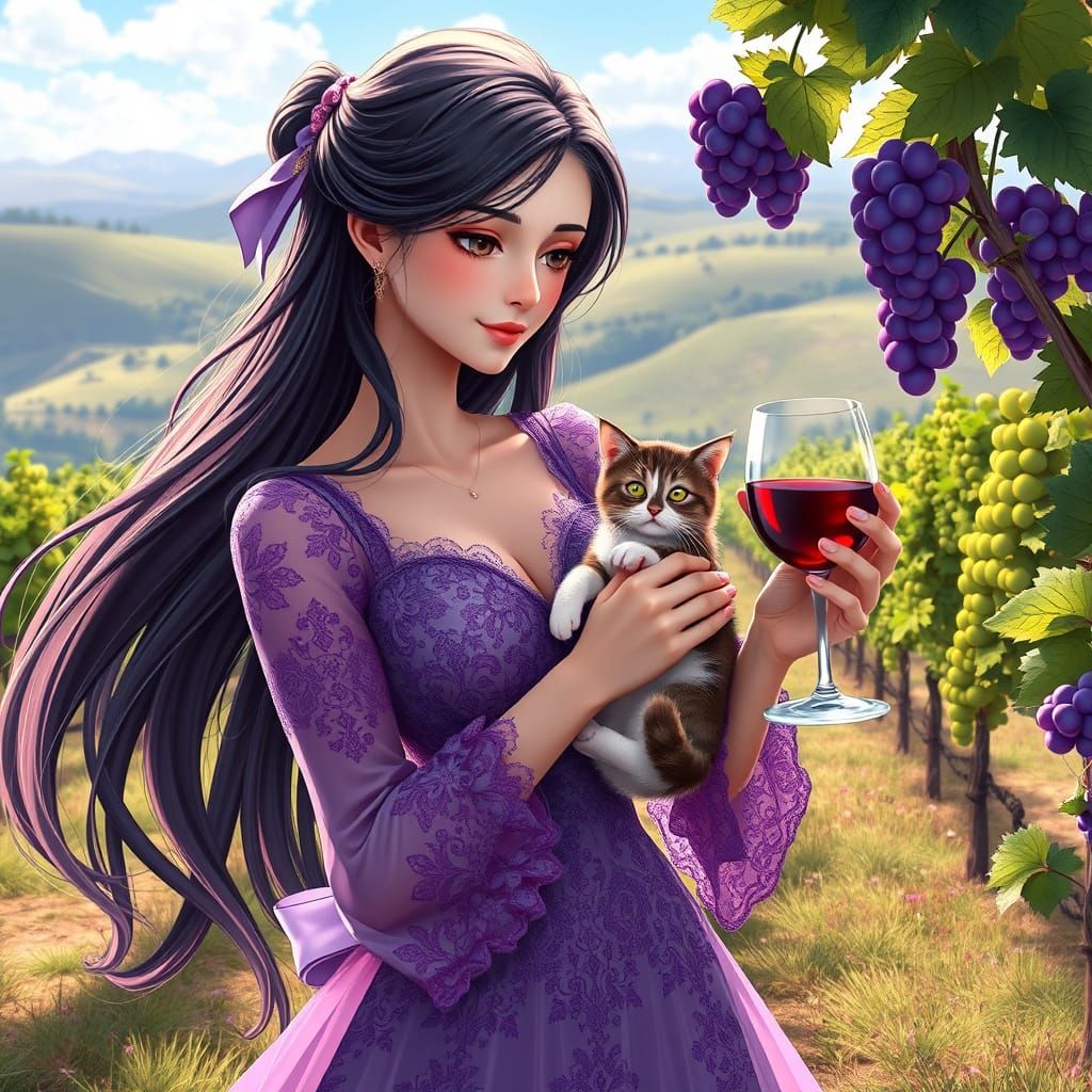 This image shows a beautiful woman in a lush vineyard setting, surrounded by rolling hills and verdant vines. She's wearing a stunning purple dress and cradling a curious cat, while gently squeezing grapes into a delicate wine glass. The artwork blends anime and 3D rendering styles, with intricate detail...