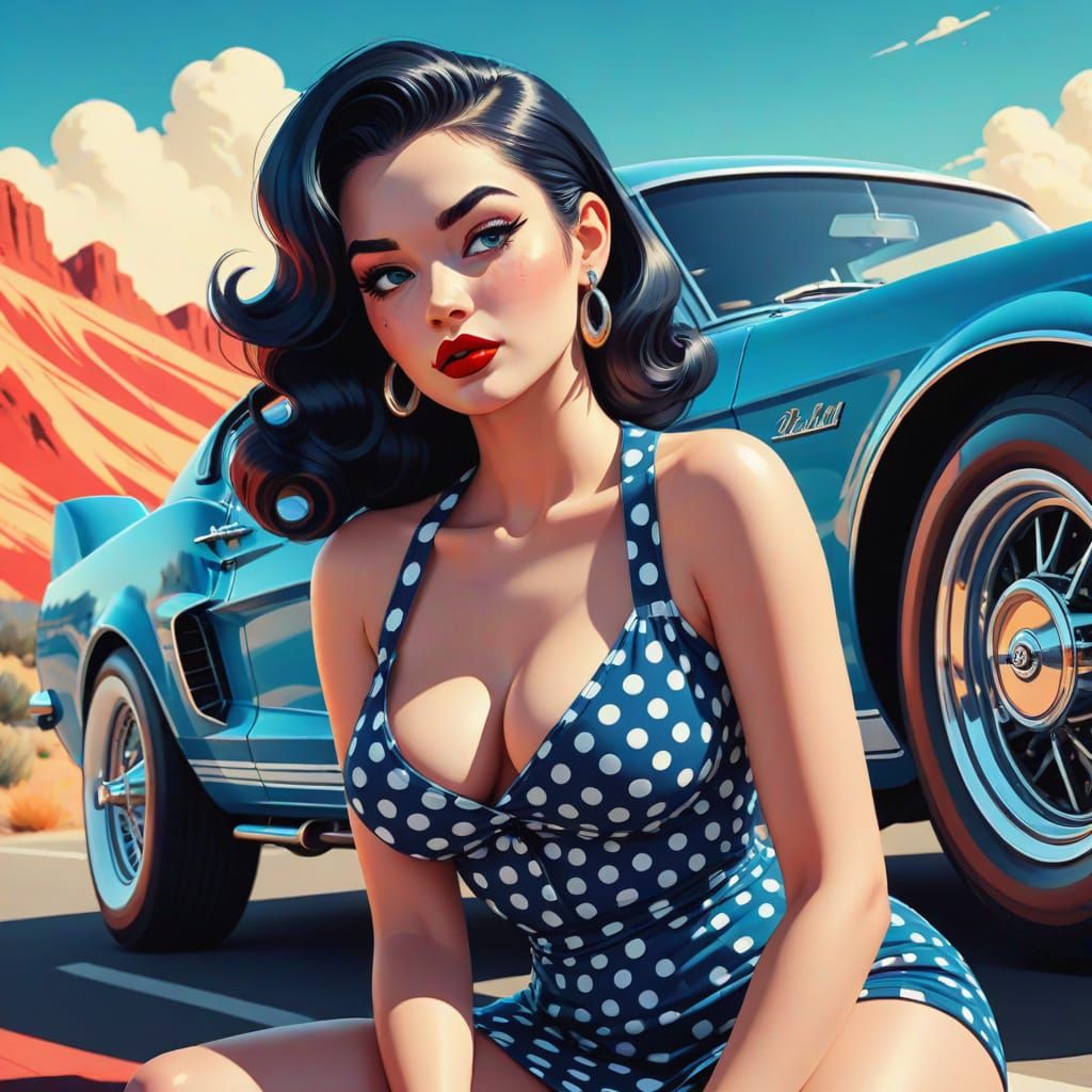 This image shows a cartoon woman in a polka-dot dress leaning on a blue Ford Shelby GT500. This vibrant and stylized artwork captures a flirty, nostalgic scene in a retro 1960s pin-up aesthetic.