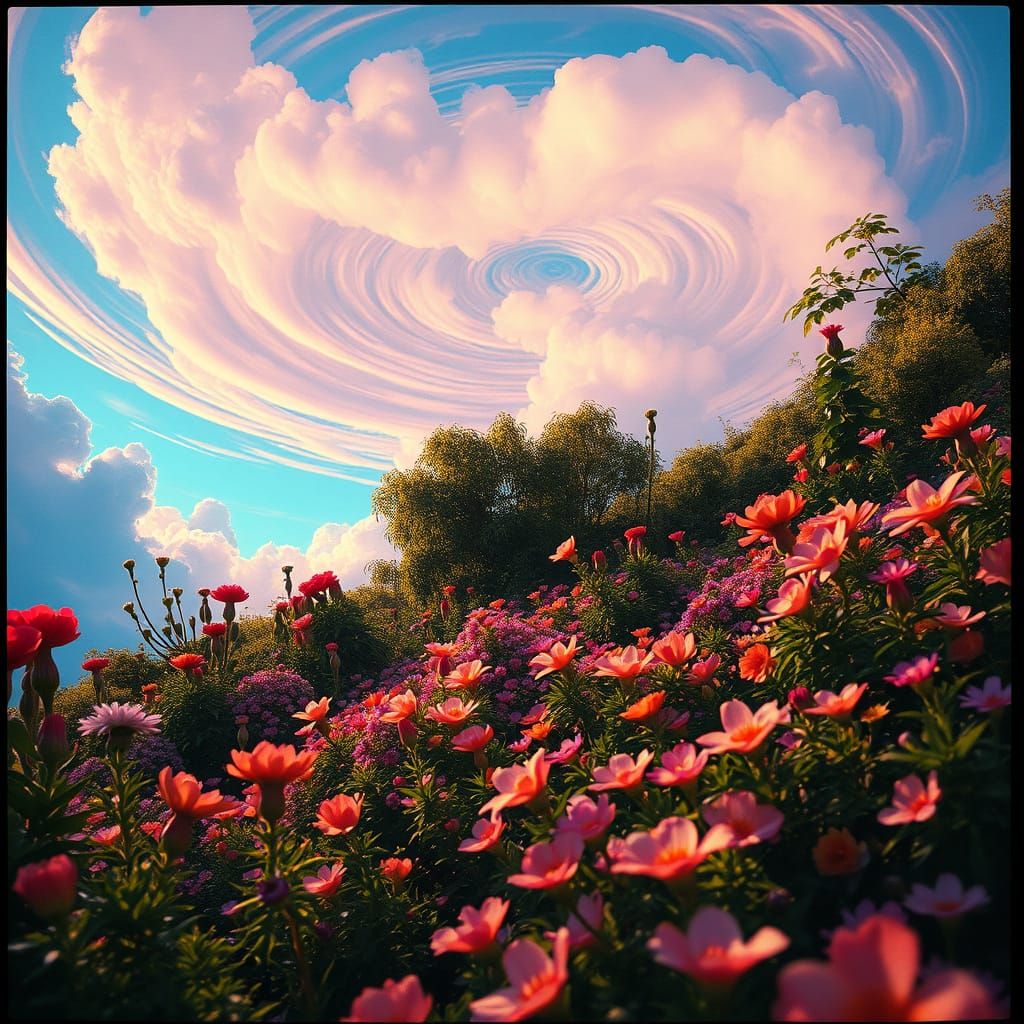 This image shows a vibrant, ethereal flower garden set against a breathtaking, swirling sky with iridescent clouds, in a fantastical, otherworldly universe, evoking the nostalgic feel of classic cinema with cinematic lighting and detailed textures.