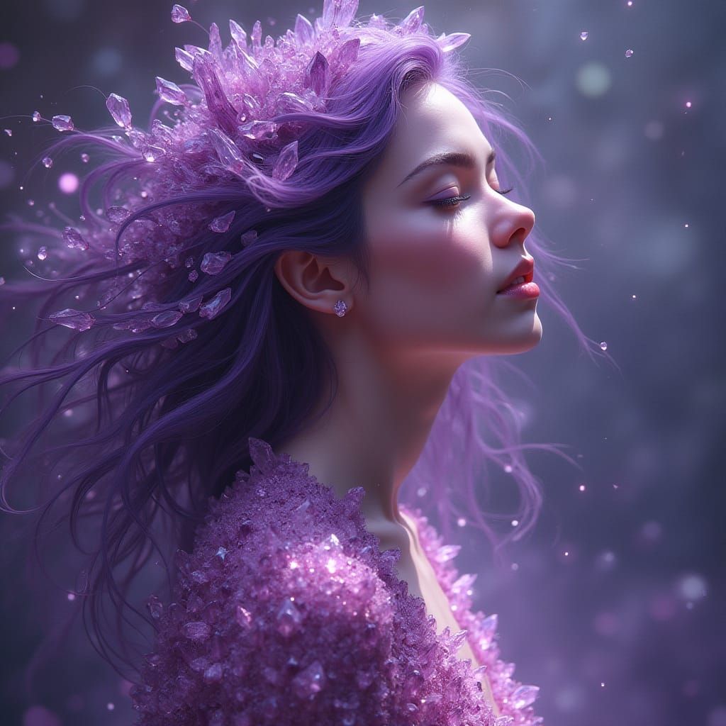A digital rendering of a woman composed of amethyst crystals against a cosmic background. The image features dynamic lighting and ornate details reminiscent of art nouveau.