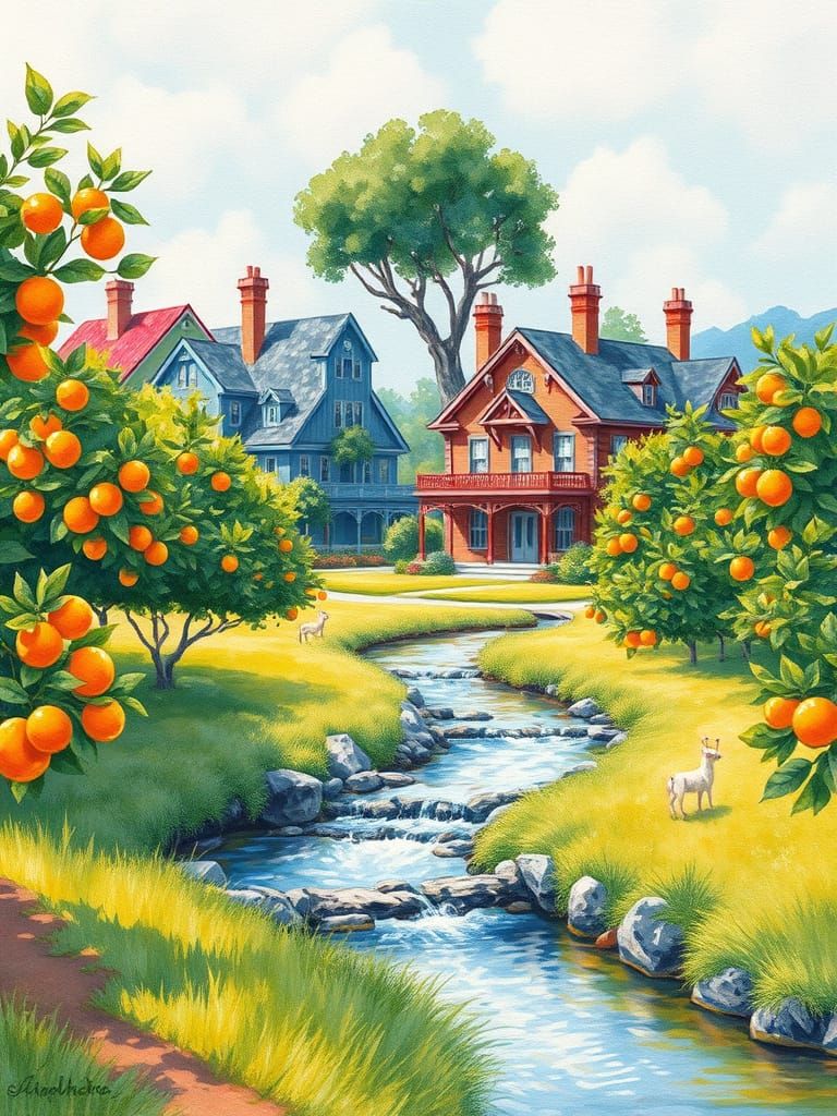 This oil painting depicts a serene orchard scene, featuring Victorian luxury houses amidst lush greenery and orange fruits, surrounded by a grassy park and a gentle stream, in a style reminiscent of Vincent Van Gogh's neo-impressionist and expressionist works.