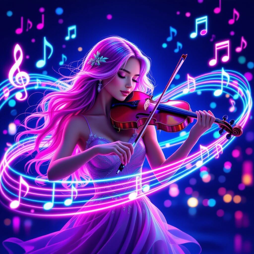 This image shows a girl with pink and cyan hair playing a violin, surrounded by glowing neon light trails forming musical staves with notes. Features a neon city bokeh background in vibrant, ultra-detailed digital art.