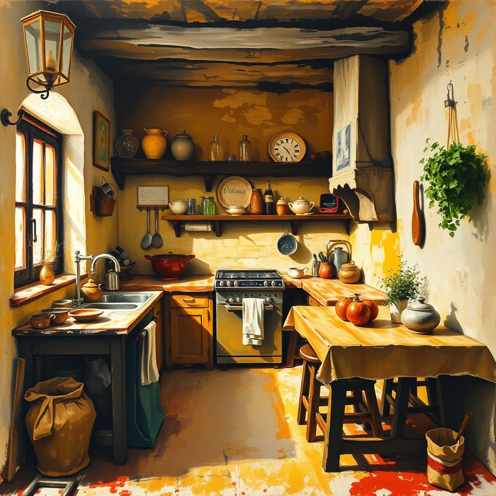 A rustic kitchen scene bathed in golden light. This image showcases a blend of gouache, watercolor, and charcoal elements, reminiscent of impressionist masterpieces with expressive brush strokes.