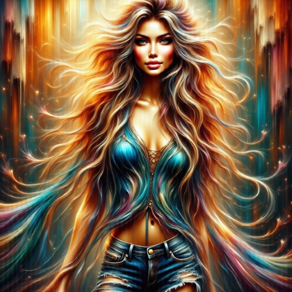 This image shows a confident woman in casual clothing. The mid shot, side lighting, and colorful background create a hyperrealistic and intricately detailed splash art aesthetic.