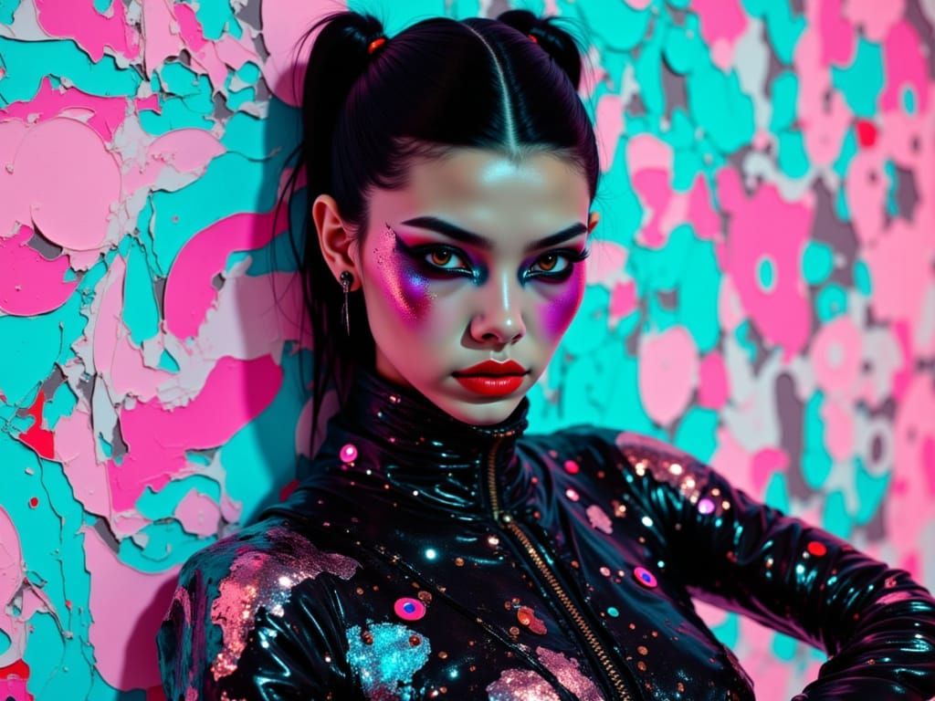 This image features Chungha as a special forces commando in futuristic techwear with pastel colors and bold lines. It incorporates mech elements, foil accents, and neon African patterns, rendered in a scratch card art style.