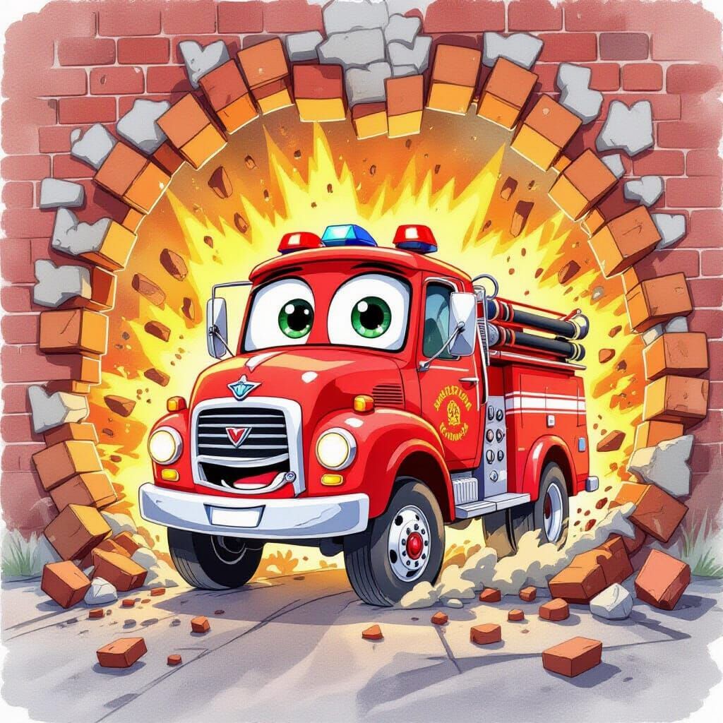 This vivid watercolor illustration features a cheerful cartoon firetruck with expressive eyes, dramatically breaking through a cracked brick fire wall with flying debris.