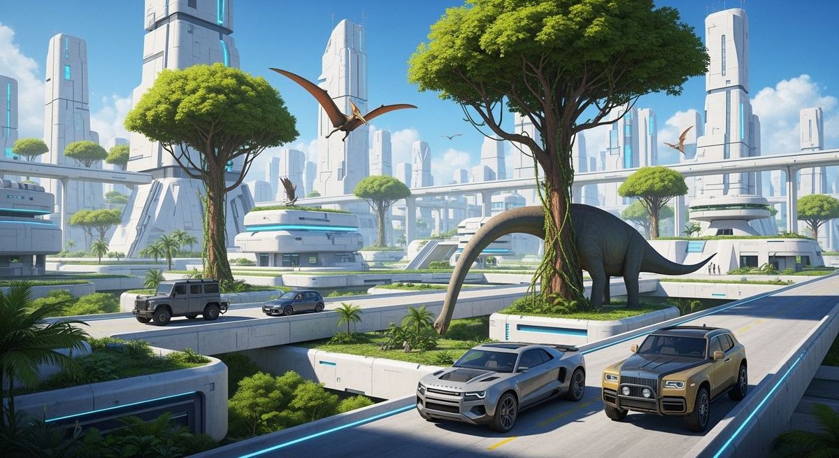 A vibrant, sun-drenched illustration of a multi-level futuristic city with brutalist architecture, integrated jungle vegetation, and soaring dinosaurs. Features sleek vehicles navigating elevated roads under brilliant sunlight.