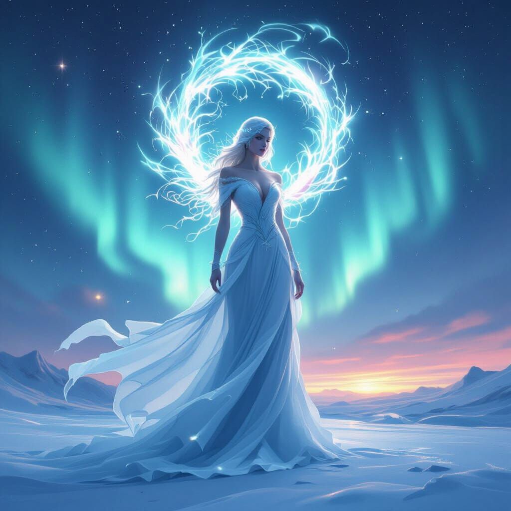 A majestic goddess embodying the aurora borealis stands draped in flowing ice-like attire. The image captures a vibrant, dreamy atmosphere reminiscent of digital artwork.