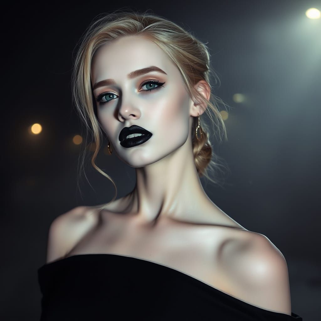 This image shows a woman with striking features in a glamorous off-shoulder dress, set against a hazy night backdrop. The image is rendered with hyperrealistic photorealism, featuring cinematic lighting and a moody, intimate atmosphere.