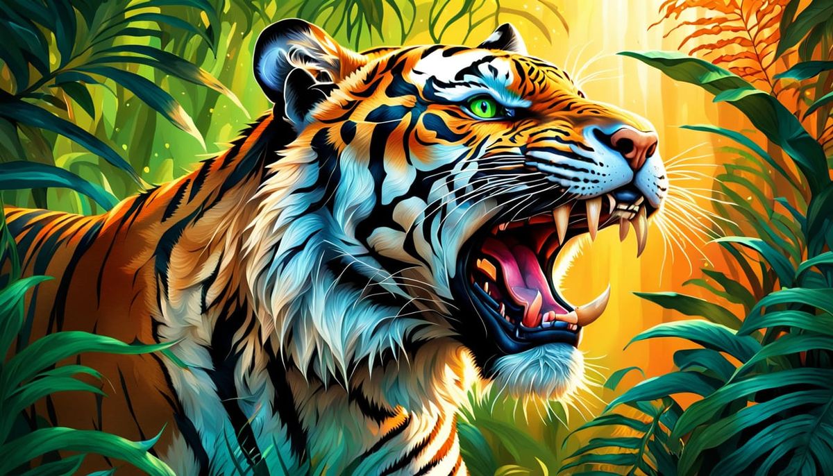 A striking picture of a roaring tiger in a jungle setting, designed as tattoo art. The composition uses vivid colors and golden light in a 3D realistic style.