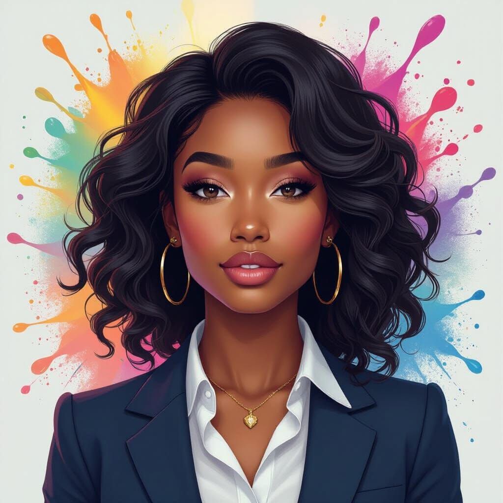 This image showcases a beautiful Black American college student at an Ivy League university, rendered in a vibrant splash art style with dynamic lighting and intricate details.