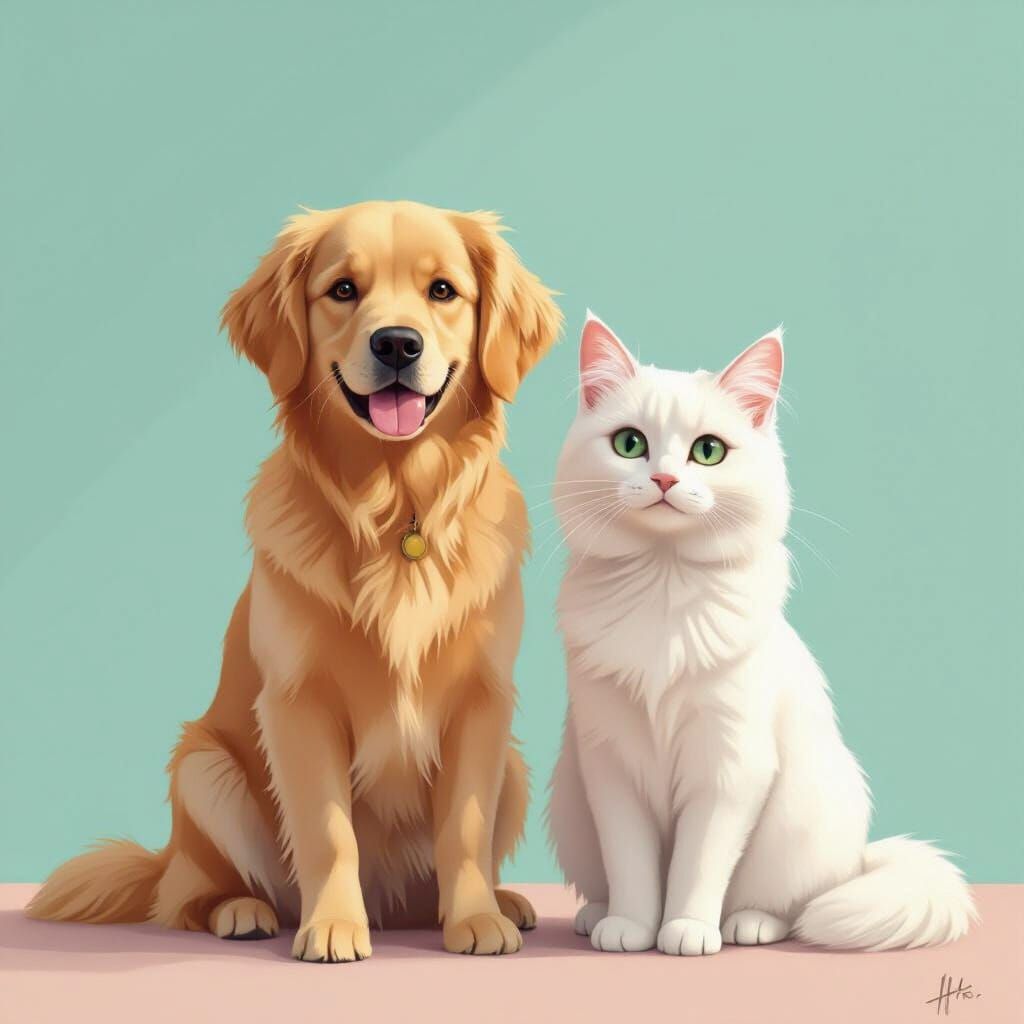 This image shows a golden retriever and a white Ankara cat as realistic mascots, sitting together in a minimalist composition. Rendered in a digital painting style with soft pastel colors and gentle lighting.